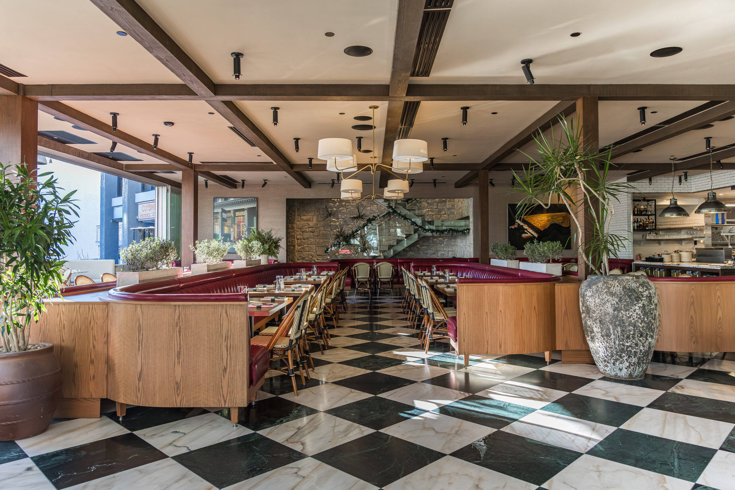 Grab a seat in our bar areas—upstairs or down—and enjoy a spritz, a signature cocktail, a glass of wine, or whatever the moment calls for. From our raw bar, choose from a selection of fresh raw oysters and chilled shrimp, or explore our hummusiya with house-made pita baked to order and bright seasonal dips. A few rotating favorites from the kitchen round out the menu. With the park just outside and a beautiful atmosphere inside, it feels like you’re leisurely enjoying a moment along the European coast. It’s the kind of spot you’ll want to escape to often.